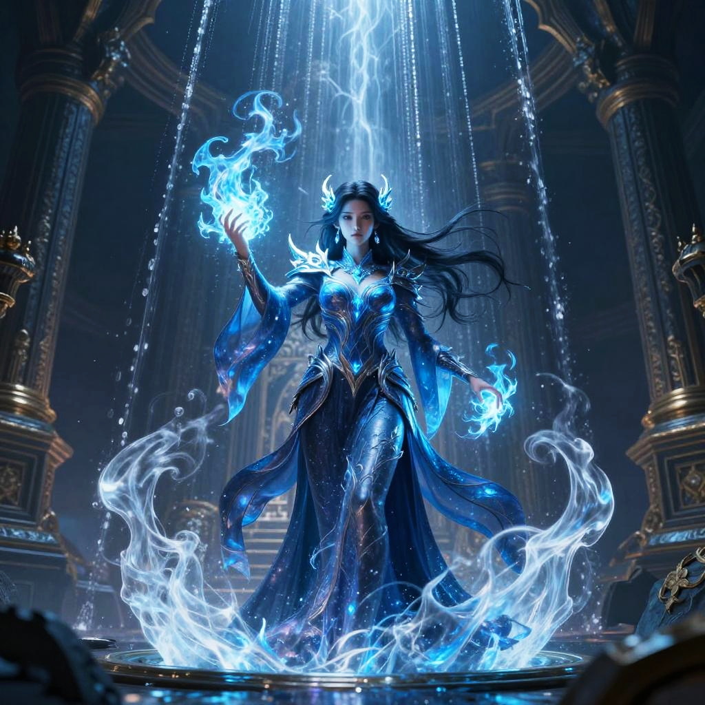 Masterpiece, best quality, (1girl), hyper realistic, illustration, deep depth of field, (full body:1.5), (Elemental Mage, summoning a storm of blue fire and ice, wearing a flowing magic robe, standing in the ruins of an ancient mysterious temple, surrounded by waterspouts radiating in all directions), 3d, realistic, (hdri, bloom, rim lighting, soft lighting, low key)
