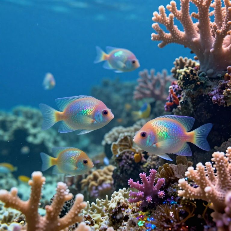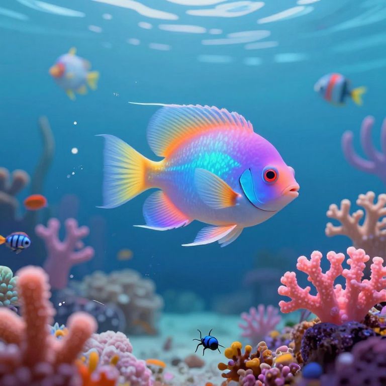 A whimsical blend of impressionism and digital art captures a sentient, neon-illuminated fish swimming gracefully through an idyllic underwater environment from the unique vantage point of a bug's perspective. The vivid palette intermingles harmoniously with the soft pastels of the coral gardens, crafting a surreal and mesmerizing ambiance that embodies both enchantment and serenity.