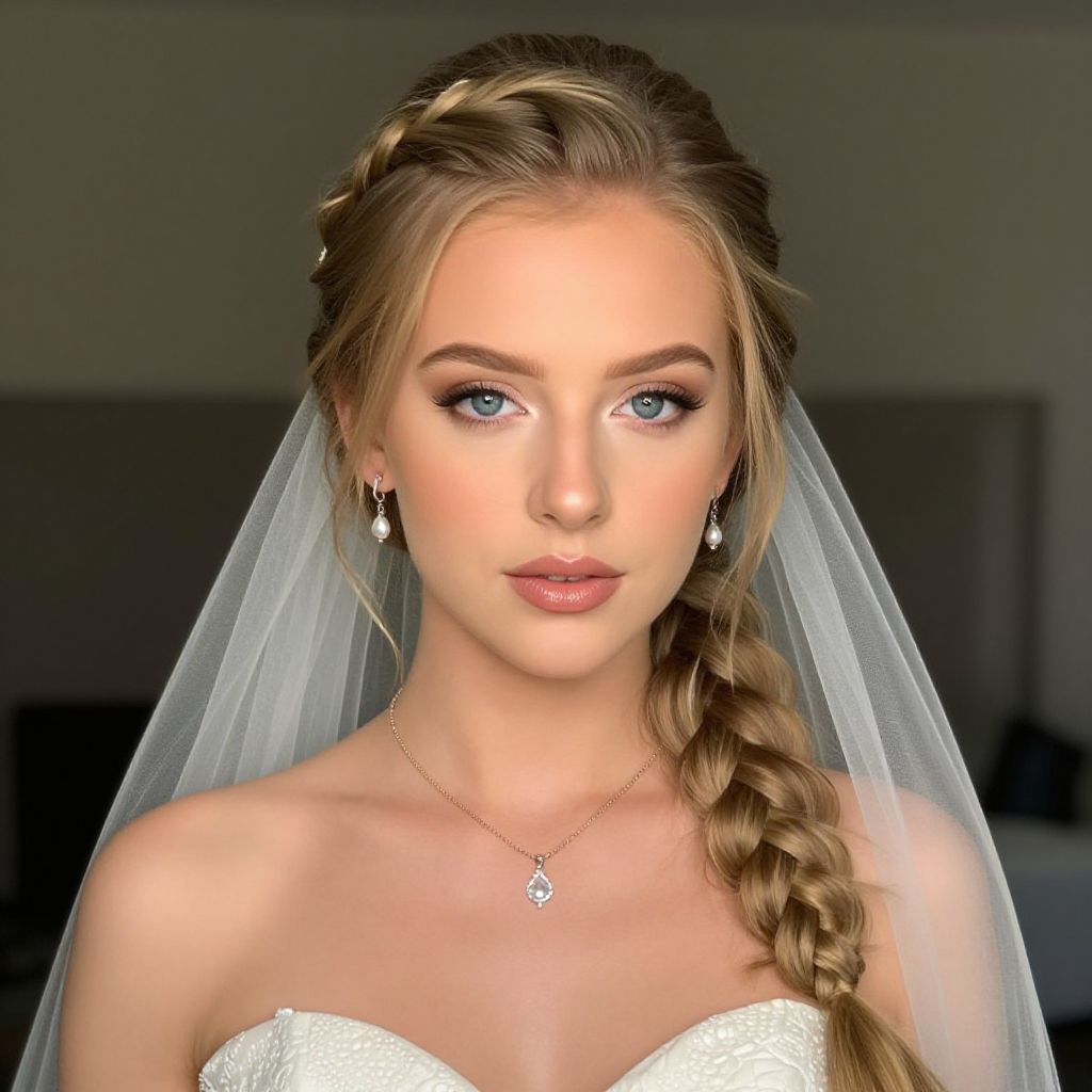 Photograph of a young Caucasian woman with fair skin and blue eyes, wearing a white strapless wedding dress with lace details. She has long, blonde hair styled in a loose side braid and adorned with a delicate veil. Her makeup is subtle with defined eyebrows, eyeliner, and pink lipstick. She wears small, dangling diamond earrings and a delicate necklace with a small, central pendant. The background is blurred, featuring dark, neutral colors, focusing attention on her. The lighting is soft, highlighting her face and veil. The image has a realistic and polished style.