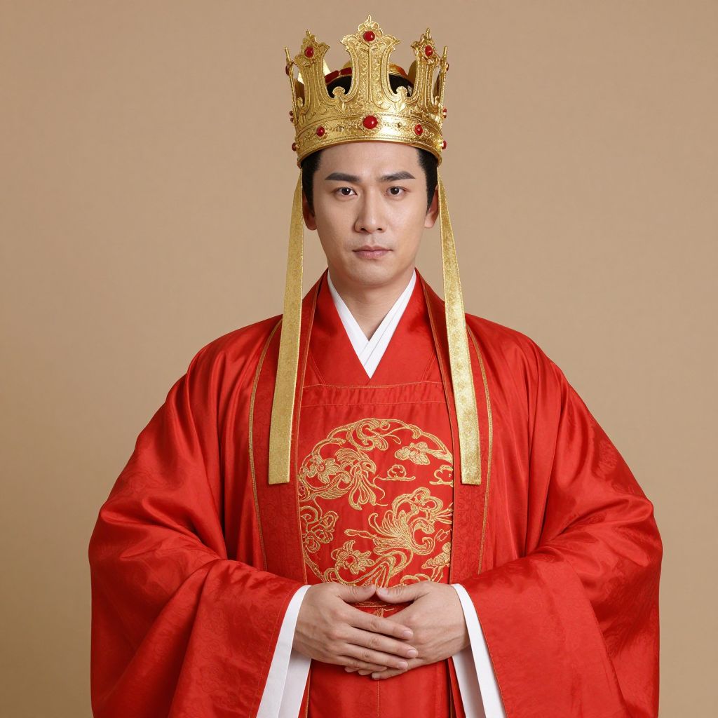Photograph of an East Asian man with fair skin and dark hair, wearing a vibrant red royal robe adorned with an intricate gold dragon pattern on the chest. He is also wearing a large, ornate gold crown with red jewels and long golden tassels hanging down on either side. His hands are clasped together in front of him. The background is a plain beige color, highlighting the subject. The man has a calm expression and is centered in the frame. The image has a formal and regal aesthetic.