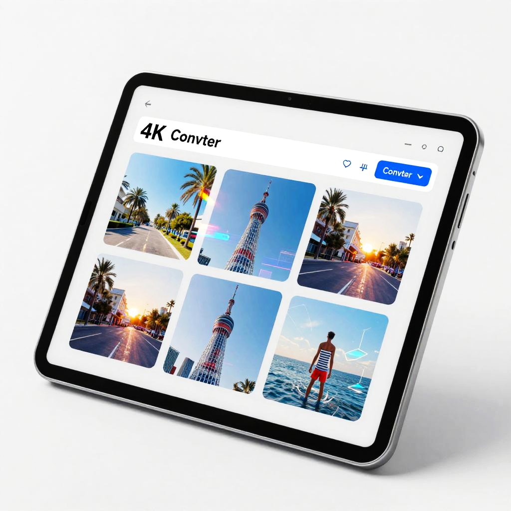 A 4k image converter software concept, featuring a digital tablet with colorful high-definition photos being converted into sharper 4k images, smooth modern UI design, holographic effects, bright and crisp cyberpunk aesthetic with light reflections