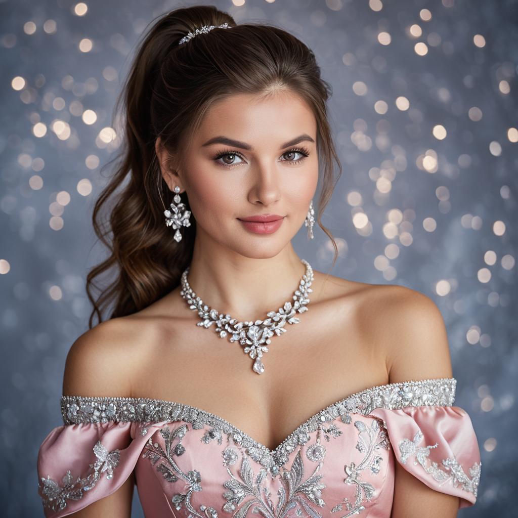 Photorealistic digital portrait of a young woman with light skin and blue eyes, featuring a fancy brown bun hairstyle with bangs. She is wearing a silver sleeveless dress adorned with sparkling embellishments, matched with silver drop earrings and a large diamond necklace with a geometric pendant. The image has a neutral gray background, soft lighting, and delicate makeup highlighting her symmetrical facial features.