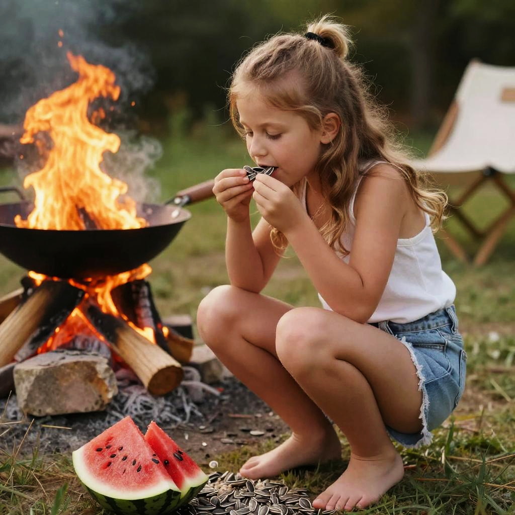 Photograph of a young Caucasian girl with light brown hair in a ponytail, wearing a white tank top and denim shorts, squatting by a small campfire. She is eating watermelon seeds from a slice of watermelon with red flesh and black seeds. The fire burns brightly, with visible flames and smoke, surrounded by logs and rocks. A white folding chair is in the blurry background, and green grass covers the ground. The girl is barefoot and focused on eating. The image has a natural, outdoor setting with warm, earthy colors.