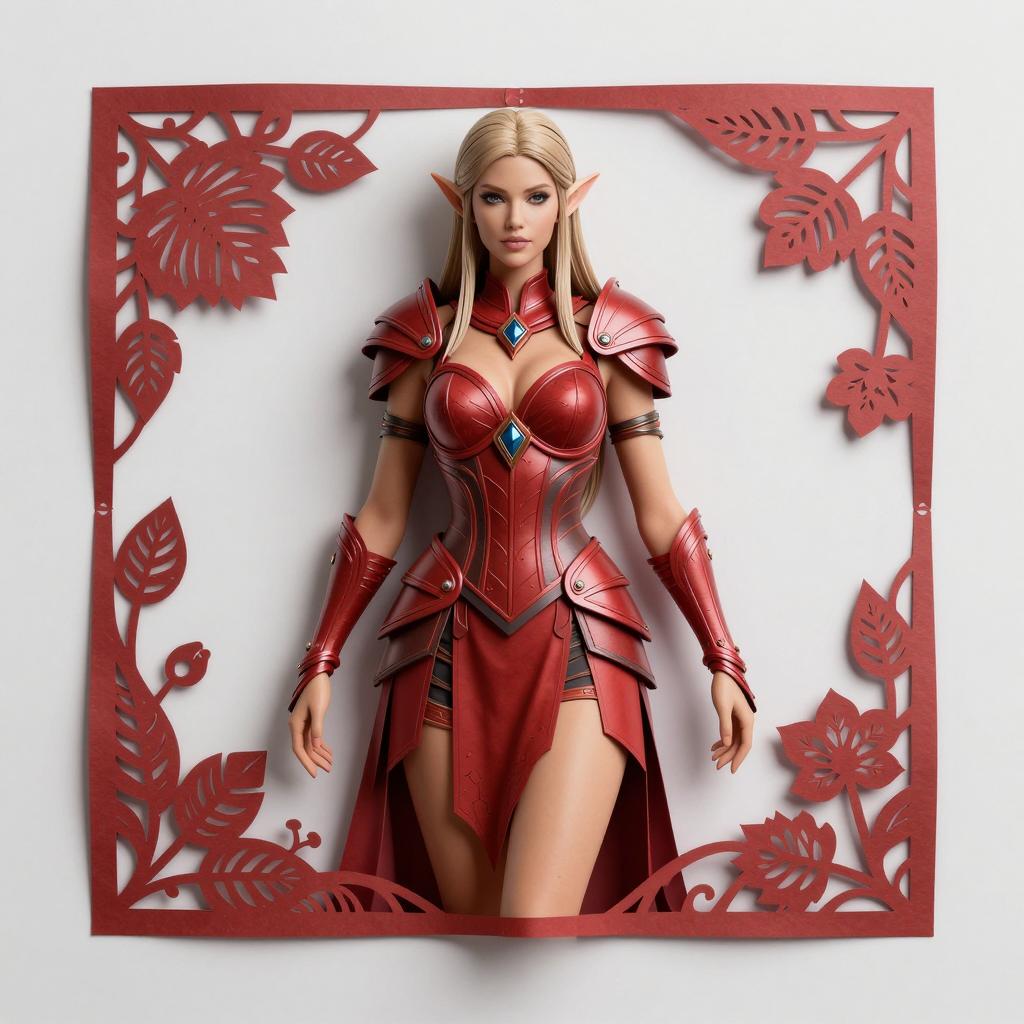 Paper-Cutting gorgeous female elfe in a dark red short dress, model body, perfect body, armored short dress, deep neckline, intricate details, ultra realistic design, heroic fantasy art, hyper detailled,