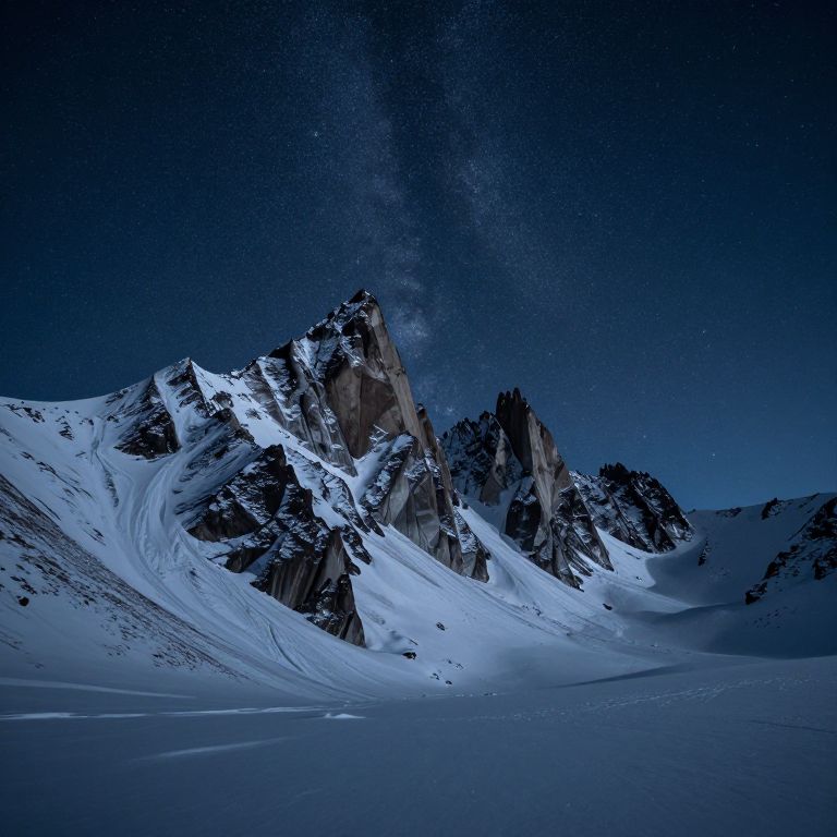 Under the watchful gaze of a starlit sky, jagged peaks stand as silent sentinels of eternity, their icy embrace whispering tales of time's relentless dance between decay and rebirth.