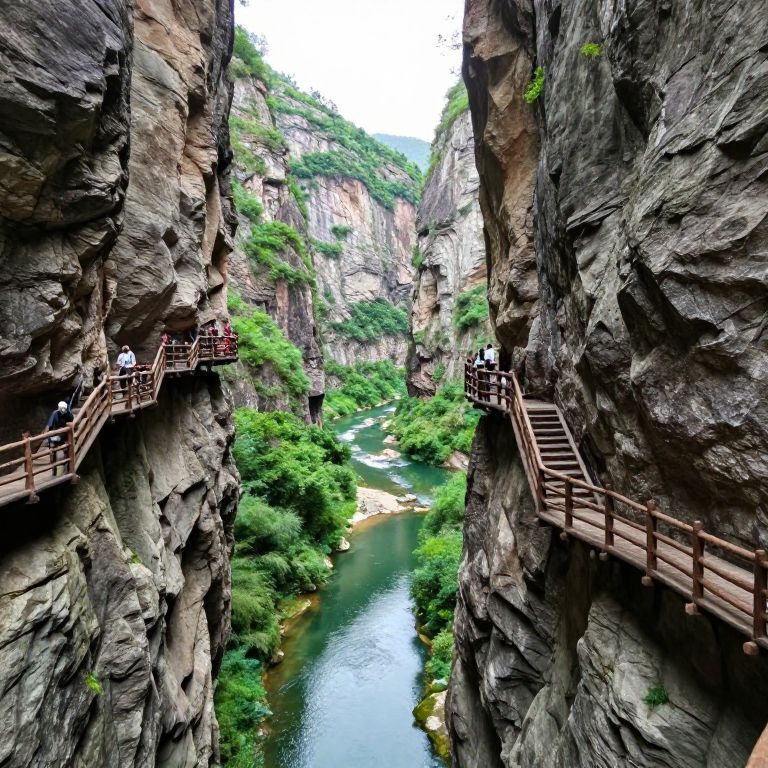 Photograph of a narrow, rocky canyon with steep, dark brown cliff walls on both sides. Wooden walkways with railings are attached to the cliffs, allowing visitors to cross over. Below, a clear, greenish-blue river flows through lush greenery and rocky patches. The sky above is partially visible, showing a bright, overcast light. Two people are visible on the left walkway, while more people are on the right. The canyon's texture is rugged, with visible cracks and layers in the rock. The scene is vibrant and natural, highlighting the dramatic landscape and human-made pathways.