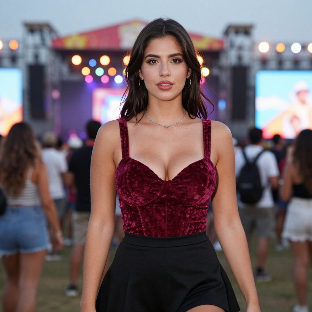 A woman in a deep red velvet top and black skater skirt, enjoying a vibrant outdoor music festival, surrounded by colorful lights and lively crowds, in the visual style of Pedro Campos. Sexy. Pretty face and beаutiful eyes. Big breasts