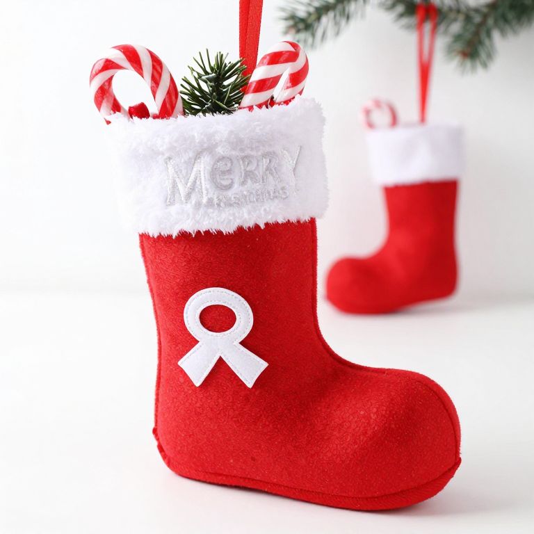 Photograph of two red Christmas stockings with white fur trim, one with a white awareness ribbon, topped with candy canes and pine.