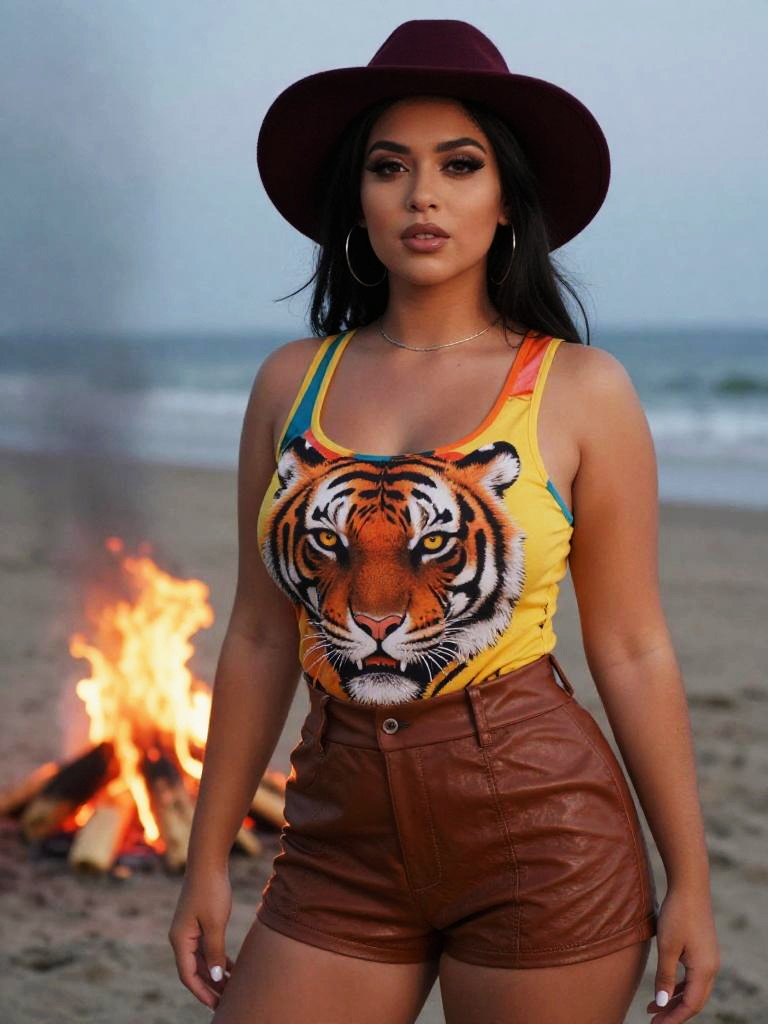 A Curvy woman in a graphic tank top featuring a tiger face, tucked into high-waisted faux leather shorts, wearing a burgundy wide-brimmed fedora, captured in the vibrant visual style of AgfaColor film at a beach bonfire with fireworks. Sexy. Pretty face and beаutiful eyes. Big breasts