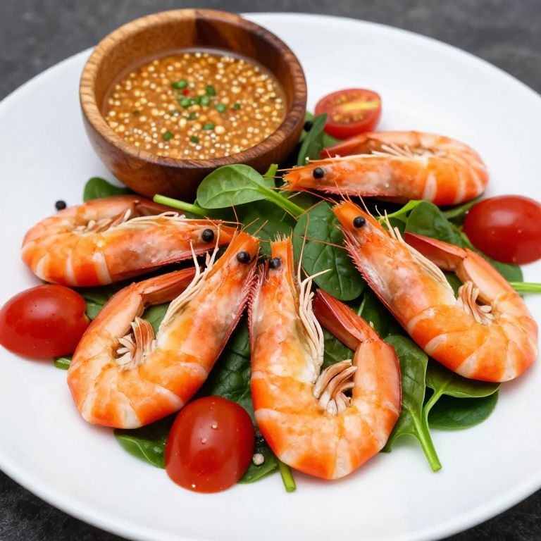 Vibrant shrimp salad presented on a pristine white serving plate, featuring plump orange shrimp, fresh green spinach leaves, and juicy red cherry tomatoes, accompanied by a small wooden bowl of spicy peanut dressing in the background.