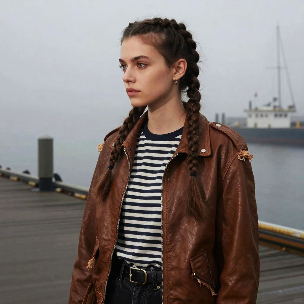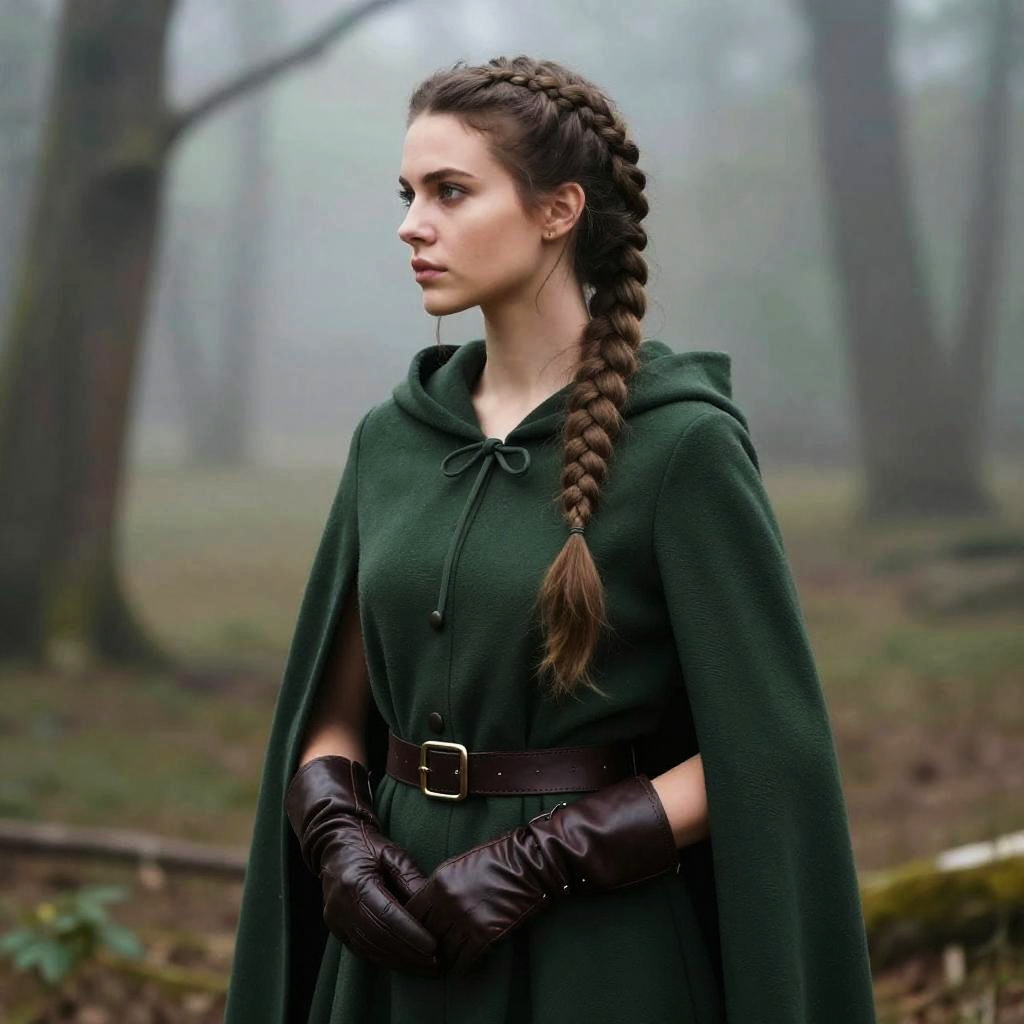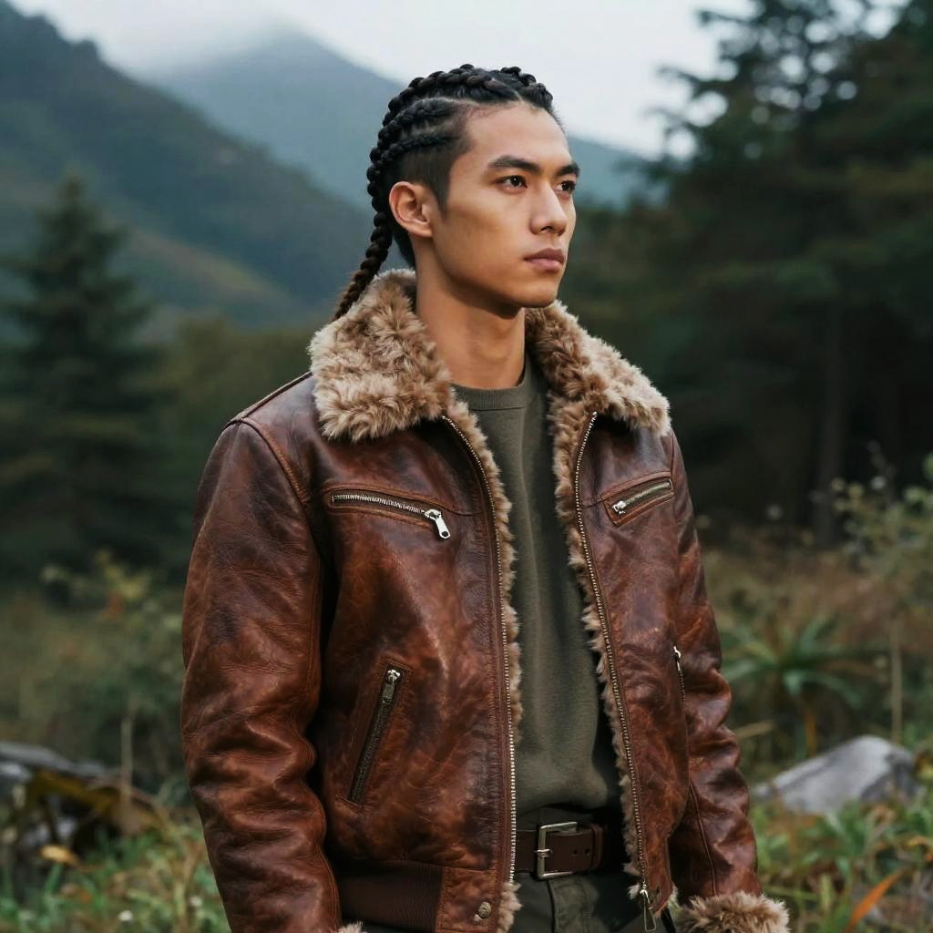 Warrior Braid hairstyle on male ranger, wearing earth-toned leather jacket with fur trim, in dense mountain forest, captured in fashion editorial style with cool morning light.
