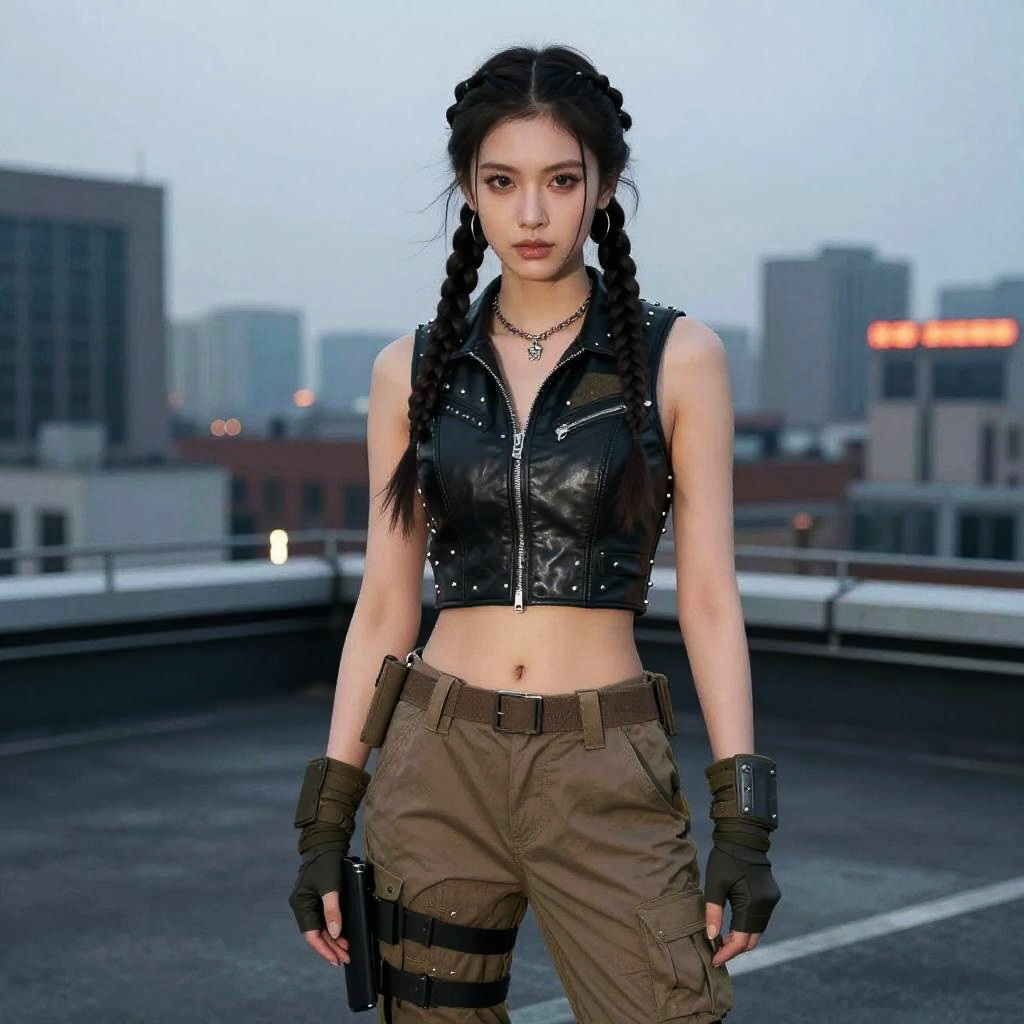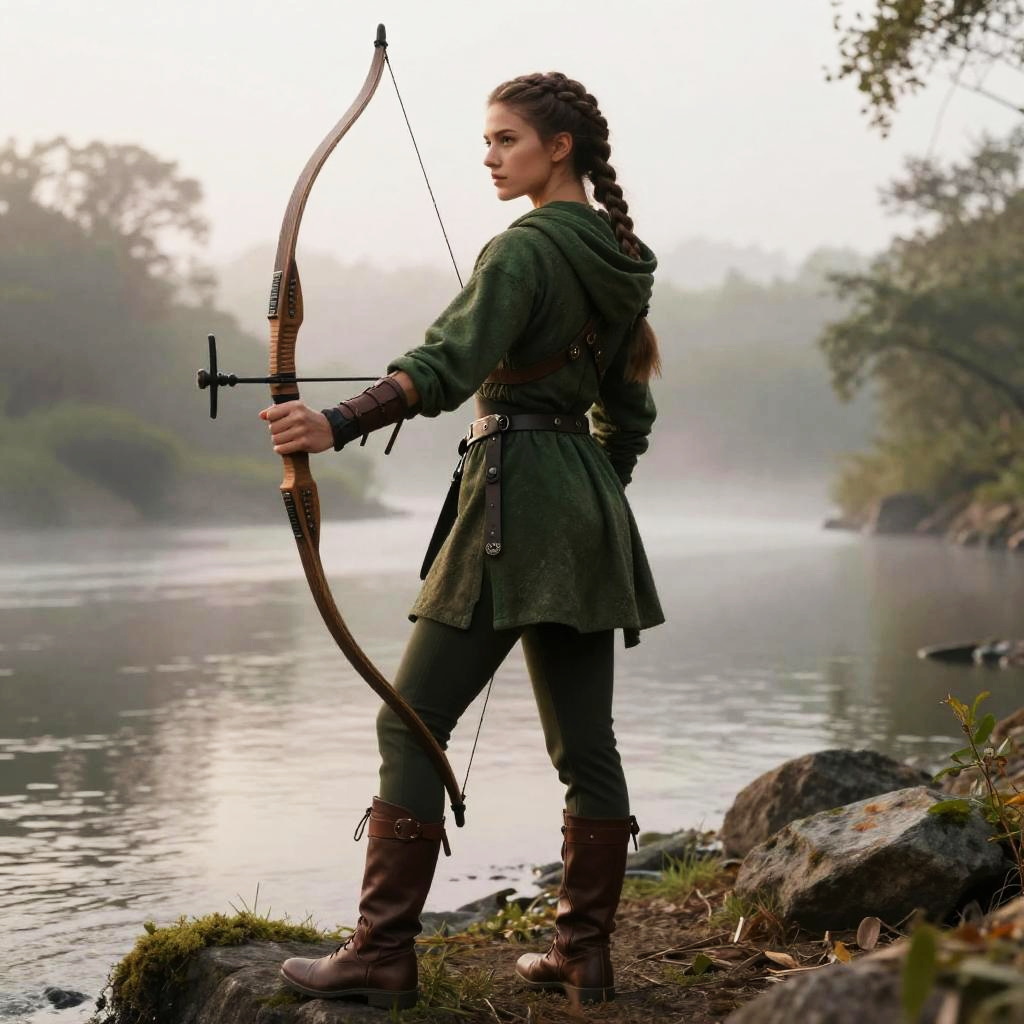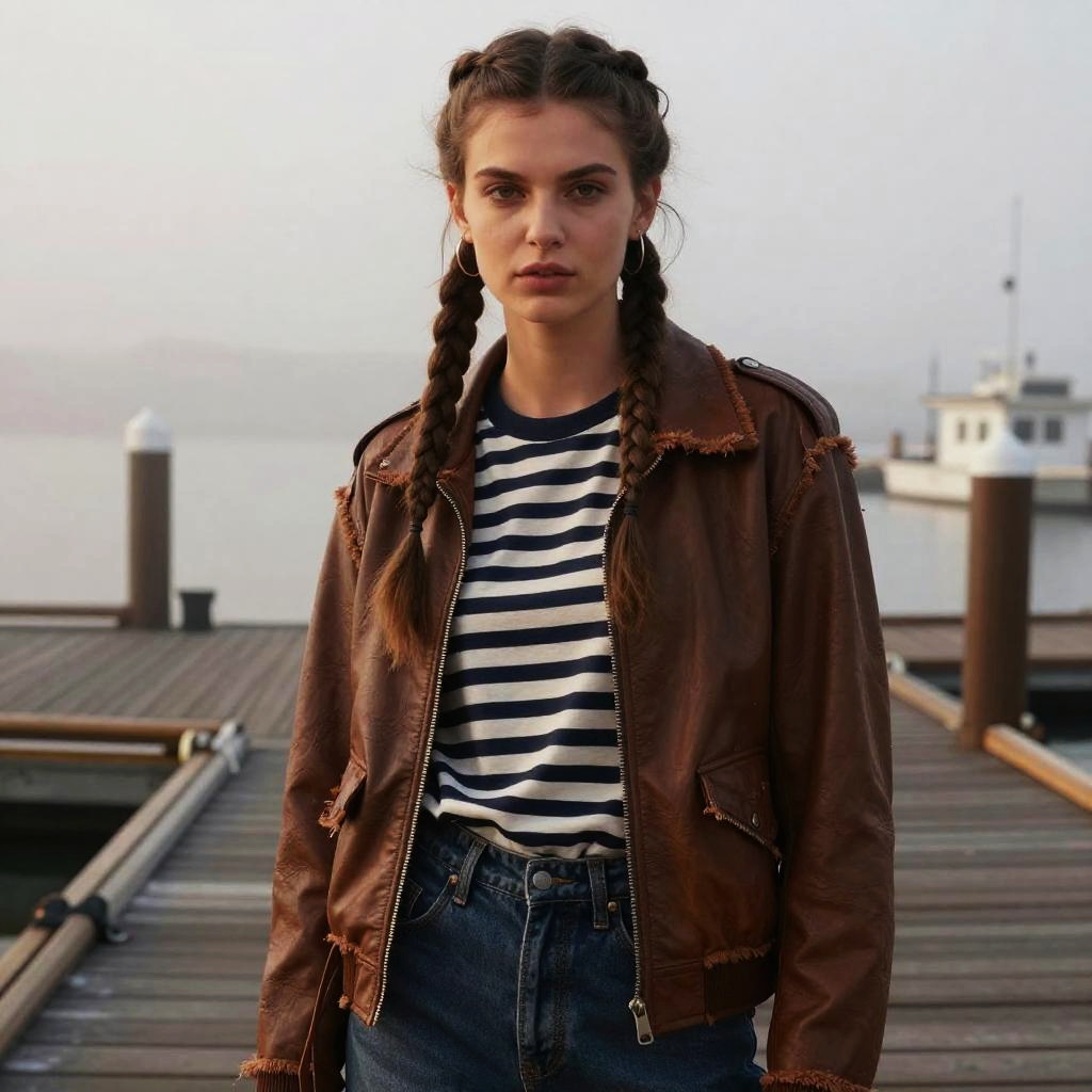 Warrior Braid hairstyle on male ranger, wearing earth-toned leather jacket with fur trim, in dense mountain forest, captured in fashion editorial style with cool morning light.