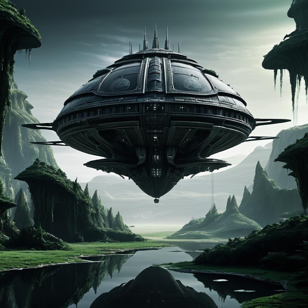 Small organic dropship lander by H.R. Giger, cinematic matte painting style.