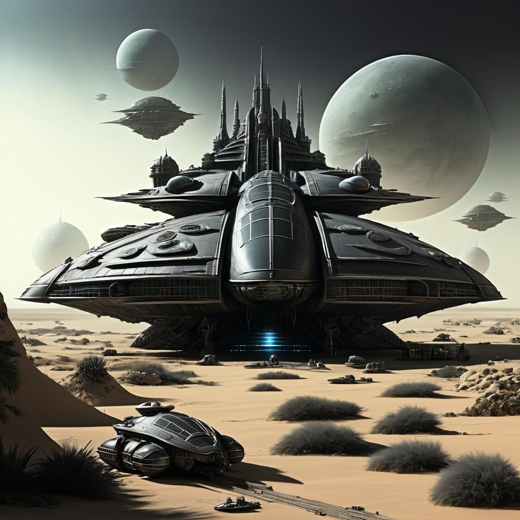 A large, detailed futuristic spaceship hovering over a sandy desert landscape with unique rock formations and sparse vegetation. Another smaller spaceship is landed nearby on the desert floor. The background features multiple planets in the sky, including a large ringed planet, creating a sci-fi alien atmosphere.