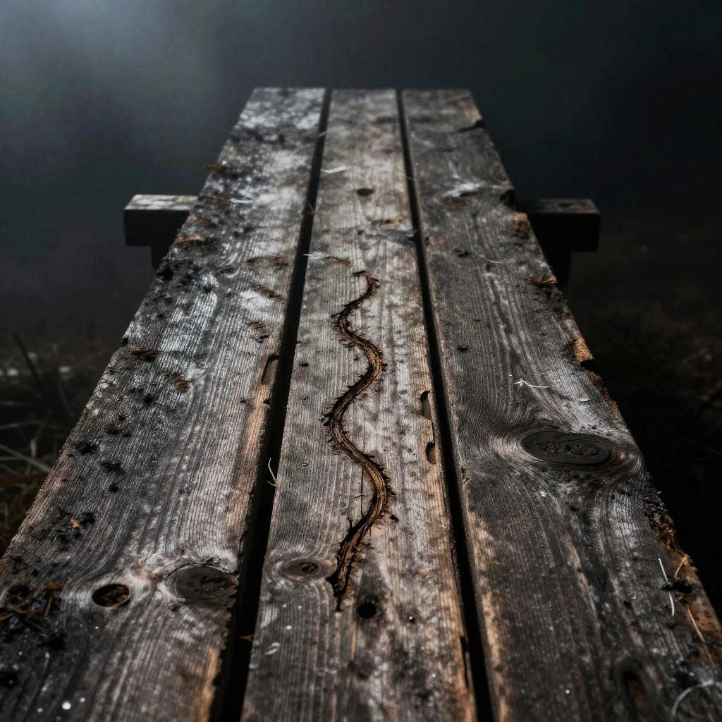Whip marks etched on weathered wooden planks, high contrast, sharp focus, rustic horror vibe, gloomy mist surrounds, eerie and unsettling ambiance, film noir style