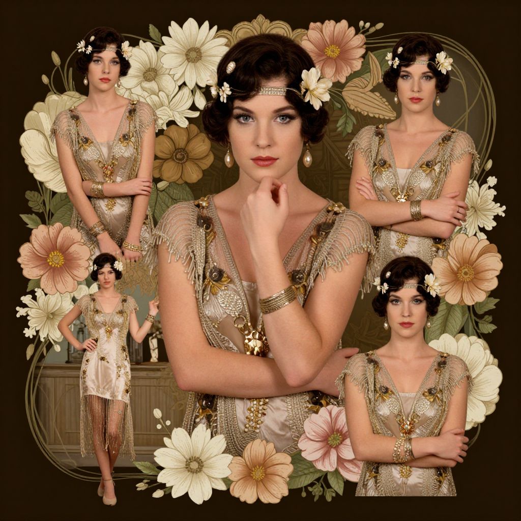 Digital art featuring a 1920s flapper woman with short, dark bobbed hair adorned with white flowers. She has fair skin, red lipstick, and blue eyes, wearing a gold-beaded, fringe-shouldered, sleeveless dress with a V-neckline, accompanied by a gold headband and bracelets. The background is dark brown with large, white and pink flowers surrounding her. She is posed in four different positions: one with arms crossed, one with a hand to her chin, one standing with arms at her sides, and one with a hand on her hip. The art style is vintage-inspired with a focus on Art Deco elements.