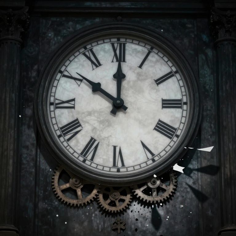 Time unravels in a haunting symphony as a towering clock, its gears dissolving into fragments, casts backward shadows that whisper the weight of transience, evoking a profound sense of melancholy and the relentless march of eternity.