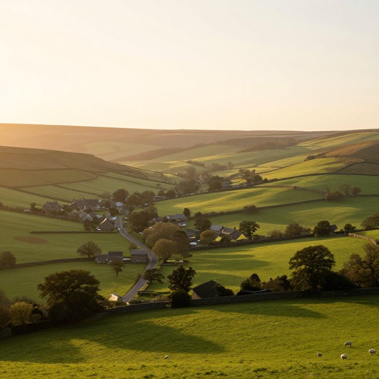 Midlands landscape at golden hour, rolling green hills dotted with quaint villages, ancient stone cottages, winding country roads, lush meadows under soft sunlight, a peaceful rural scene with towering oak trees and grazing sheep, atmospheric and serene.