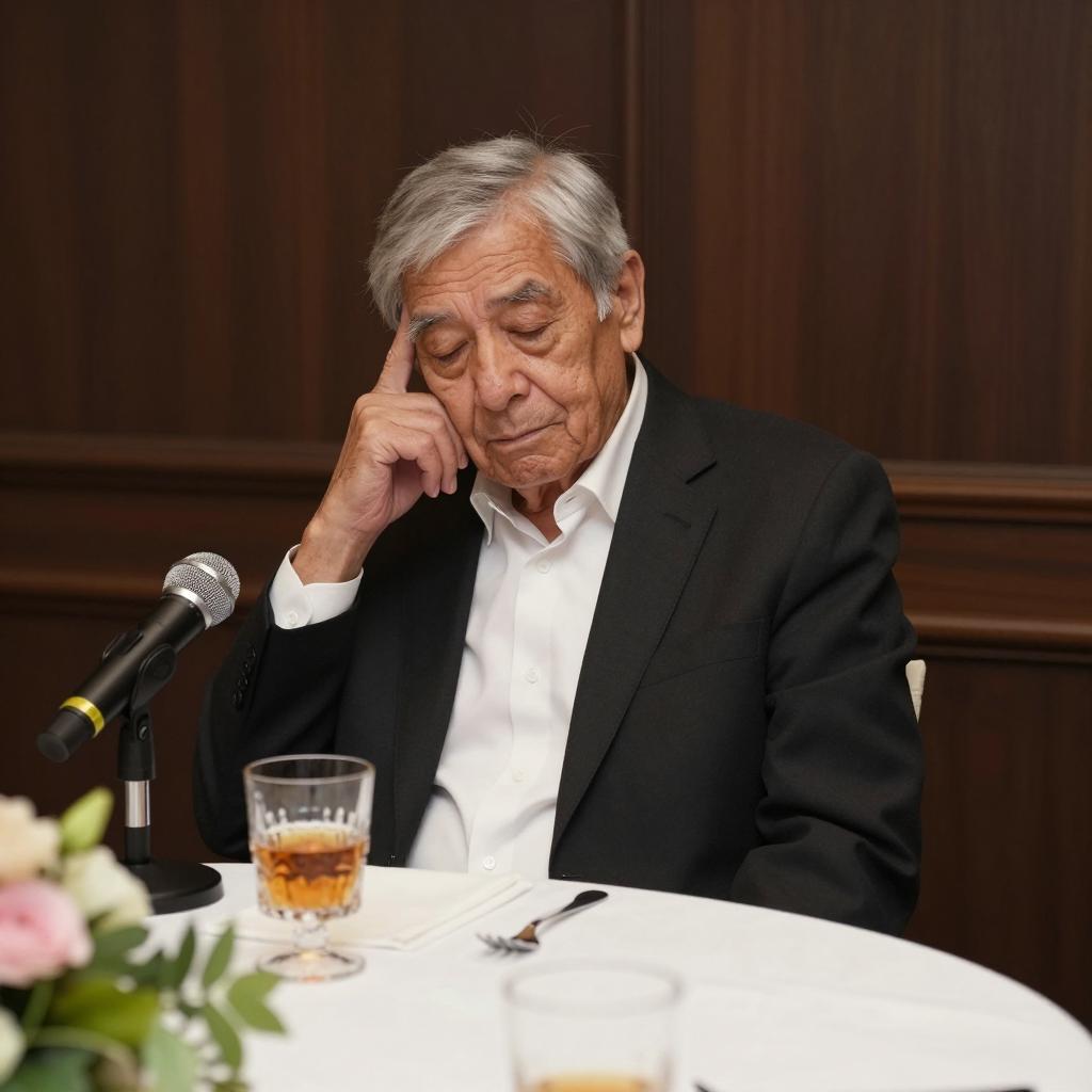 Old man with gray hair, wearing black suit and white shirt, leaning on right hand, eyes closed. Table with glass, drink, and microphone stand. White cloth with greenery and pink flowers. Dark, ured wall background.