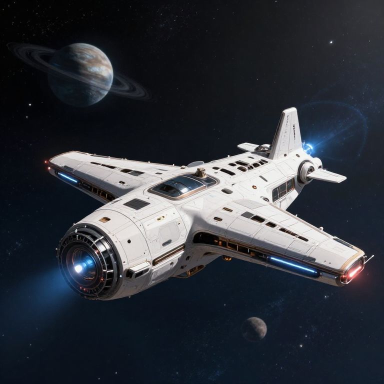 Digital illustration of a white, futuristic, twin-engine spaceship with blue and red lights emitting from its front and rear. The ship has a sleek, angular design with multiple rectangular windows and a cockpit. It flies through a starry, black space with small stars scattered throughout. In the background, a large planet with rings and a smaller planet are visible. The spaceship's surfaces are highly detailed, with a smooth, metallic texture. The image has a vibrant, sci-fi aesthetic, emphasizing the ship's advanced technology and the vastness of space.