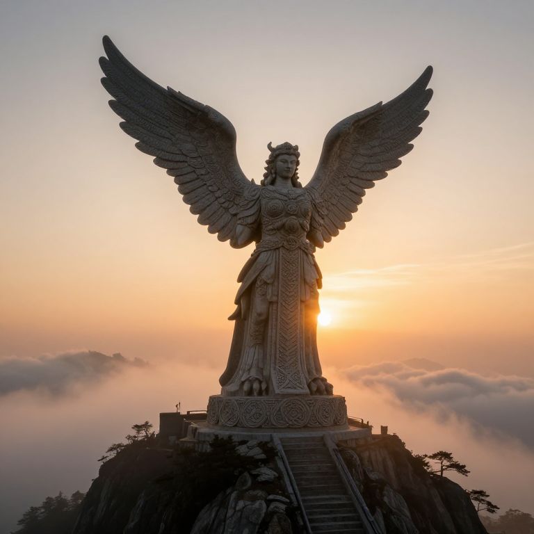 Photograph of a towering winged statue at sunset, with the sun glowing behind it, set on a rocky hilltop surrounded by clouds.