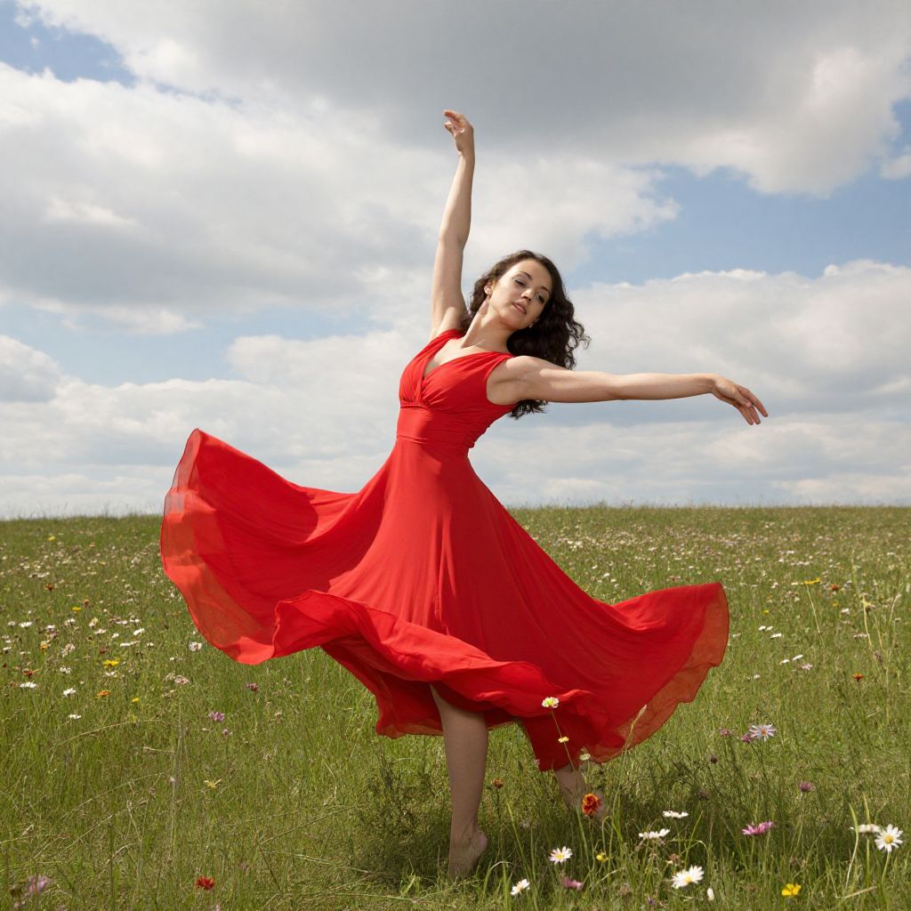 Woman in a flowing red dress gracefully dancing through a sunlit meadow filled with wildflowers under a partly cloudy sky.