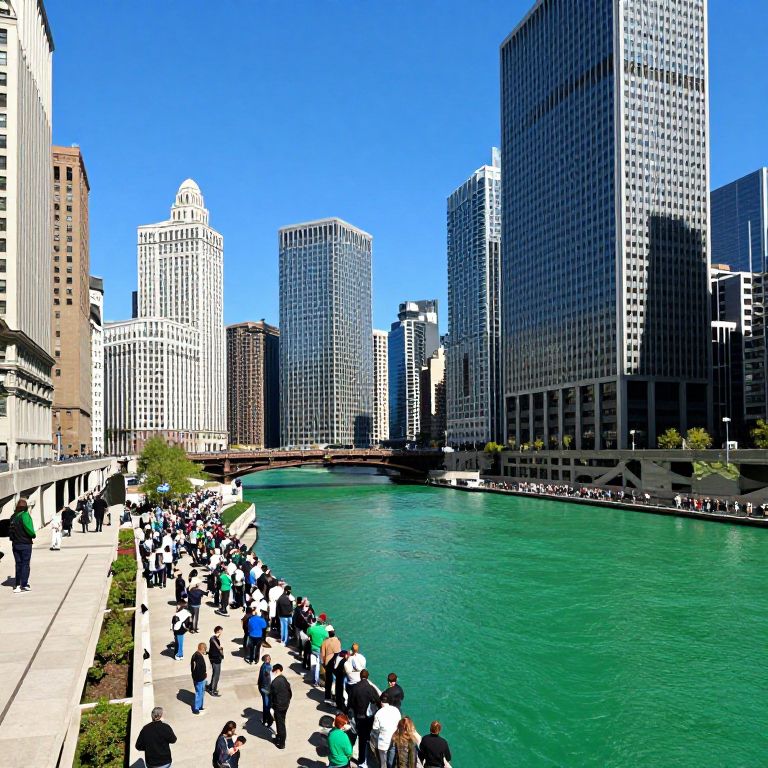 Chicago River transformed into vibrant green hues for St. Patrick's Day, surrounded by tall skyscrapers and bustling crowds gathered along its banks under a clear blue sky.