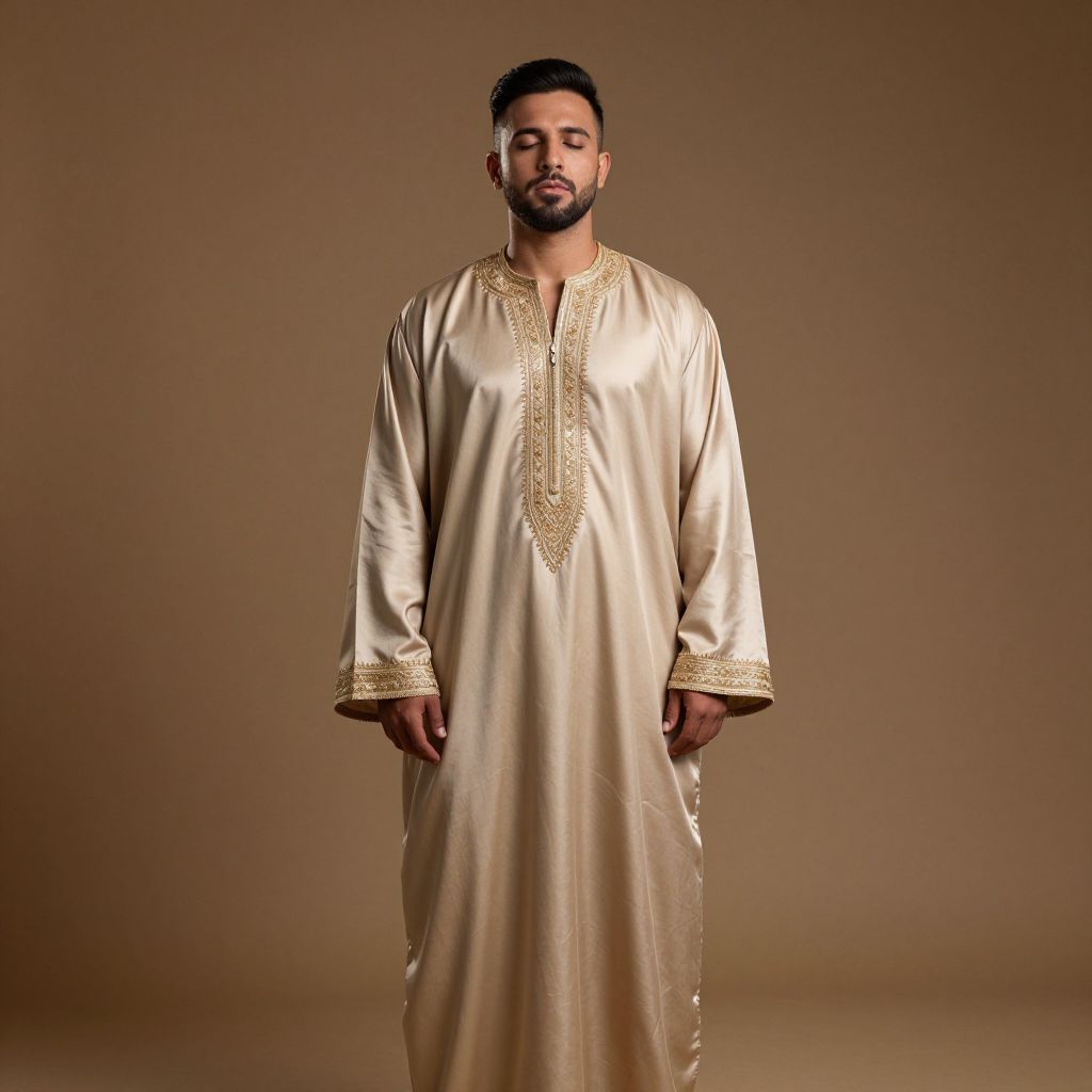Photograph of a bearded Middle Eastern man with medium brown skin and short black hair standing against a plain brown backdrop. He wears a long, shiny, cream-colored silk thobe with intricate gold embroidery along the neckline and cuffs. His eyes are closed, and he stands with a calm, neutral expression. The thobe's fabric has a smooth, reflective texture, and the gold embroidery adds a touch of elegance and traditional style. The lighting is soft, highlighting the thobe's sheen and the man's relaxed posture.