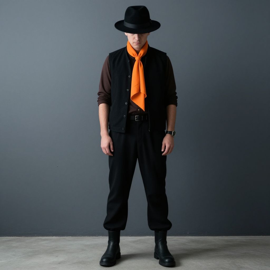 Man wearing a brown hat, orange vest, brown pants, and brown boots. He is holding a pumpkin in his right hand and wearing a black belt. The man has a beard and mustache, and is standing in a room with a few potted plants.