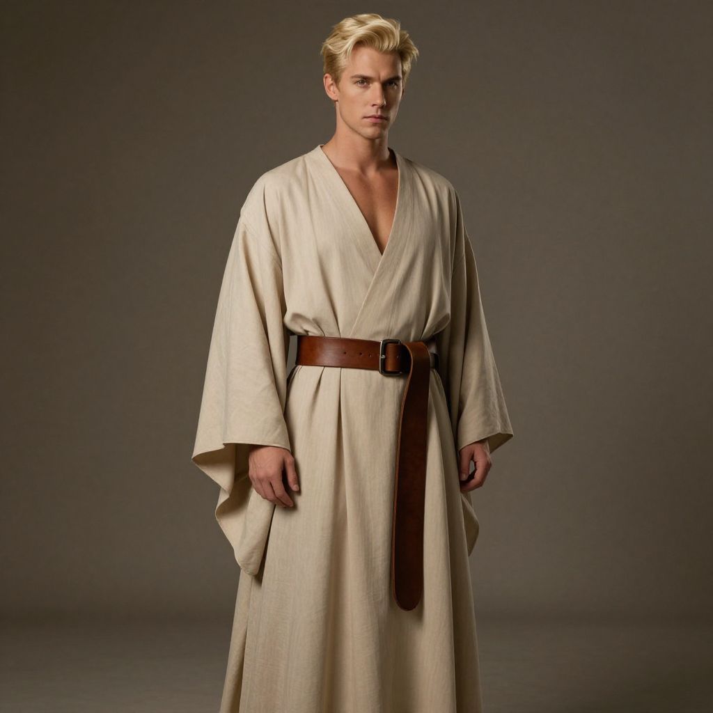 A handsome man with bright blonde hair, possessing a serious and contemplative expression, is elegantly draped in a flowing beige robe cinched at the waist with a rich brown leather belt. Full body shot, cinematic lighting, hyperdetailed, photorealistic.
