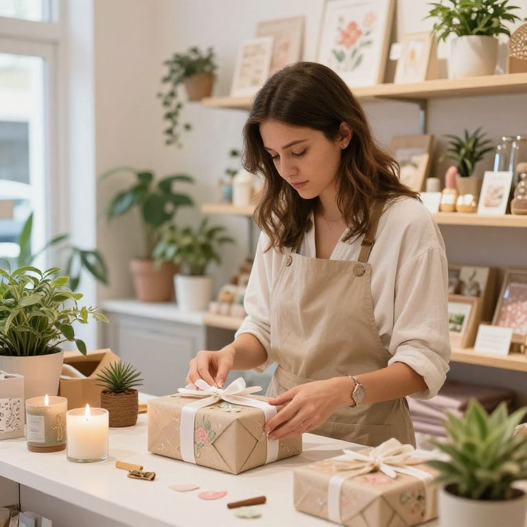 Shopkeep carefully wrapping a delicate handmade gift in a quaint boutique filled with plants, candles, and artisan goods, soft pastel color scheme, warm ambient lighting, and detailed cozy interior setting.