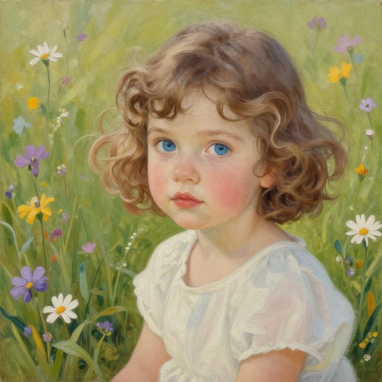 Realistic digital painting of a curly-haired, blue-eyed child with rosy cheeks, wearing a white dress, surrounded by colorful wildflowers in a sun