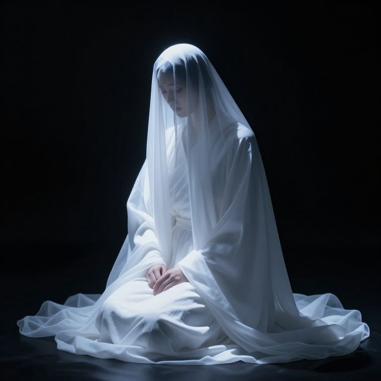 Photograph of a ghostly figure in white, translucent veil, sitting on dark background, illuminated from below, creating a mysterious, ethereal atmosphere.