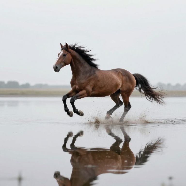 Photorealistic digital artwork of a galloping brown horse with a black mane and tail, capturing mid-stride with powerful, muscular legs. The horse's reflection is sharply mirrored in a wet, glossy surface beneath it. In the misty background, a faint, translucent image of another horse is visible, adding depth. The background is a bright, white, foggy sky, enhancing the horse's vibrant brown coat. The image emphasizes motion and energy, with the horse's muscles and mane detailed and dynamic. The overall style is hyper-realistic, focusing on the natural beauty and power of the horse.