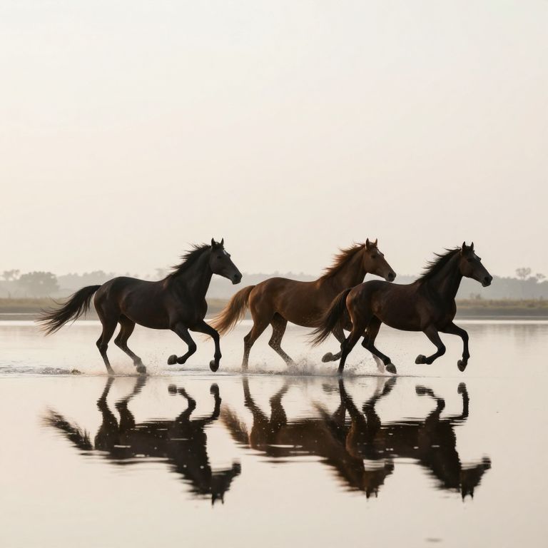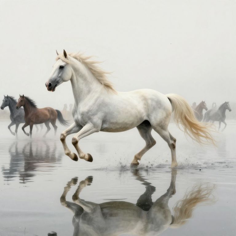 In a serene, mirror-like expanse where reality blurs into reflection, a majestic horse gallops with ethereal grace, its hooves stirring ripples that echo into infinity, while its companions fade into a dreamlike haze of timeless motion.