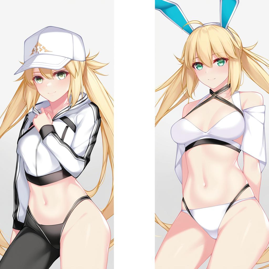 Artoria caster (swimsuit) (fate), fate (series), 1girl, rabbit ears, green eyes, blonde hair, long hair, very long hair, twintails, ahoge, small breasts, medium breasts, thighs, navel, white bikini, baseball cap, white jacket, shrug (clothing), white headwear, cropped jacket, black pants, long sleeves, bare shoulders, white hat, by artist deetamu, leet