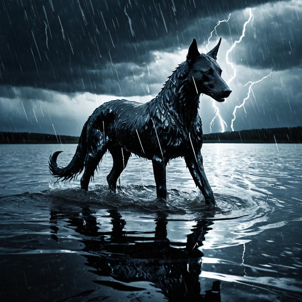 Fantasy kelpie made of liquid mercury, with reflective flowing lines. Set in a stormy lake, within a ominous environment. Highly detailed high contrast illustration with storm-lit flashes.