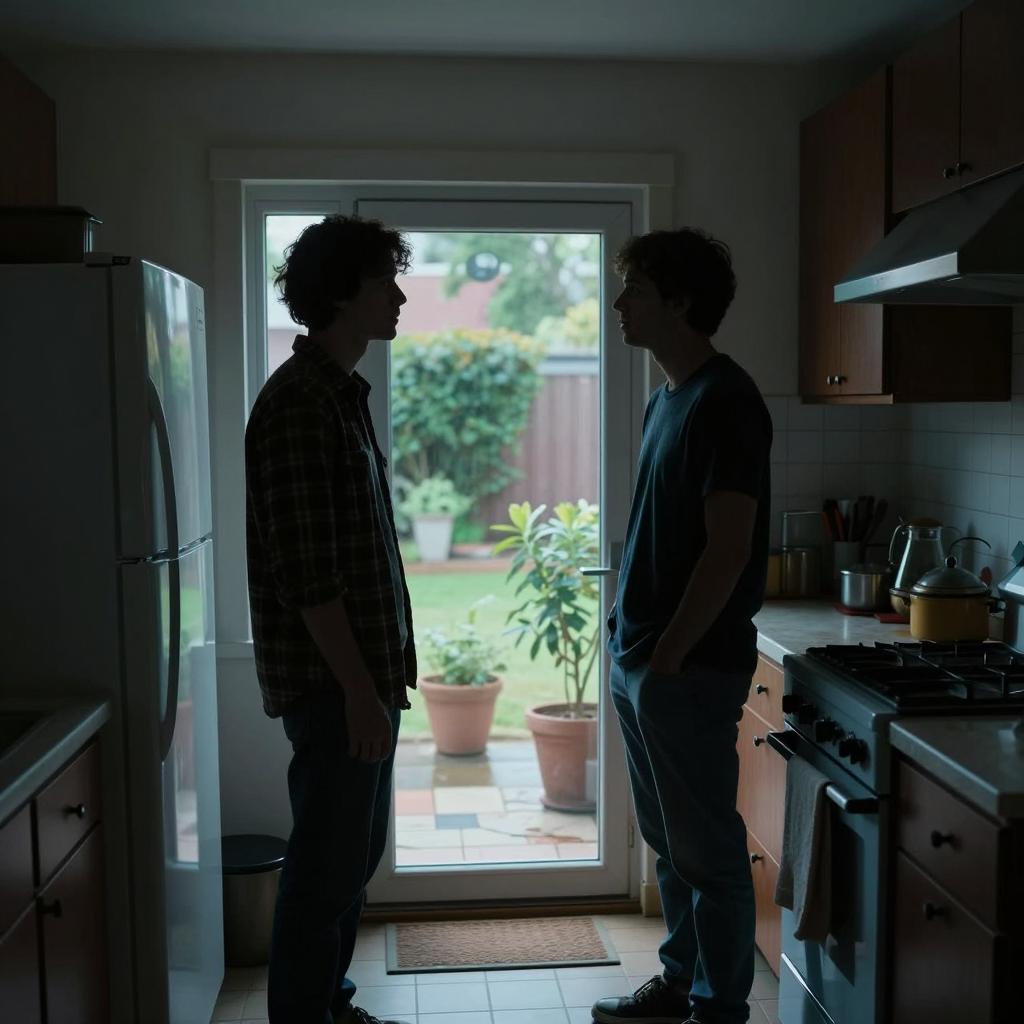 Two silhouetted men stand in a dimly lit kitchen. One wears a plaid shirt, the other a plain shirt. A glass door with a garden view is in the background. Dark cabinetry and a refrigerator are on the left. Blue light illuminates the right side.