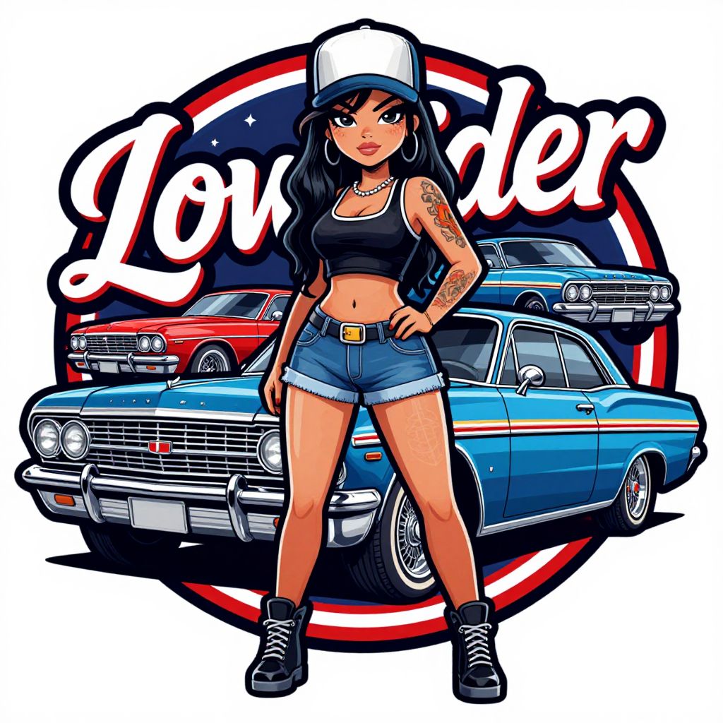 The image features a highly detailed, 2D cartoon-style illustration of a young Latina woman standing in front of a classic car, which is part of a logo design. The woman has long, wavy black hair, a confident posture, and is wearing a black tank top, denim shorts, and a white cap. She has a tattoo on her left arm, adding to her edgy appearance. The car behind her is a vintage model with a shiny chrome grille, round headlights, and a sleek design, suggesting a lowrider style. The background includes a circular emblem with additional cars and a stylized text that reads \"Lowrider\" in a bold, artistic font. The overall color palette is rich and vibrant, with a mix of blues, reds, and metallic tones, creating a dynamic and eye-catching composition. The image has a rip style, with a high level of detail and a sense of depth, making it appear almost three-dimensional. The entire scene is outlined in black, giving it a clean and polished look.