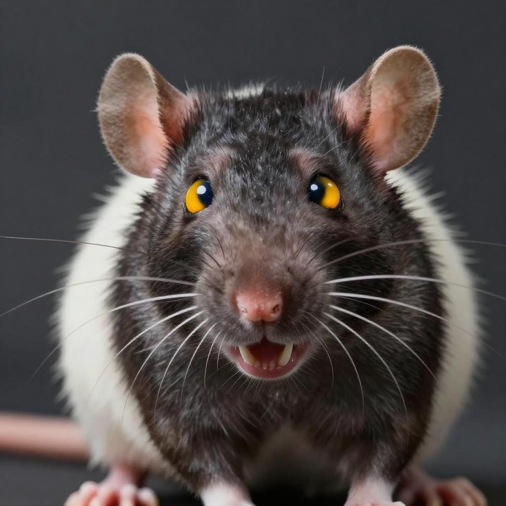A hyper-realistic, close-up photograph of a fierce-looking rat with glowing yellow eyes, sharp teeth, and an open mouth. Its fur is primarily black with white patches, and it has large, pink ears. The rat's whiskers are long and white, contrasting against its dark fur. The background is dark and blurred, making the rat the focal point. The lighting highlights the rat's textured skin and detailed features.