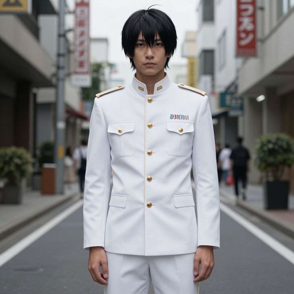 Photograph of an Asian man with black hair in a white military-style uniform with gold buttons, standing on a city street. Urban background with buildings and