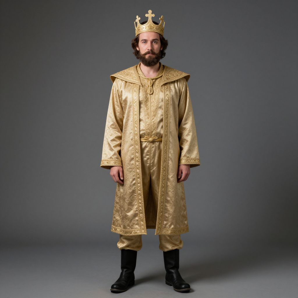 Photograph of a bearded man with a medium build, light skin, and brown hair wearing an elaborate golden king's costume. The outfit includes a long, gold embroidered robe with a high collar and matching gold pants, black boots, and a gold crown with ornate details. He stands against a plain, gradient grey background, facing forward with a neutral expression. The golden fabric has a shiny, textured appearance, and the crown has small, decorative jewels. The overall style is regal and medieval, emphasizing opulence and royalty.