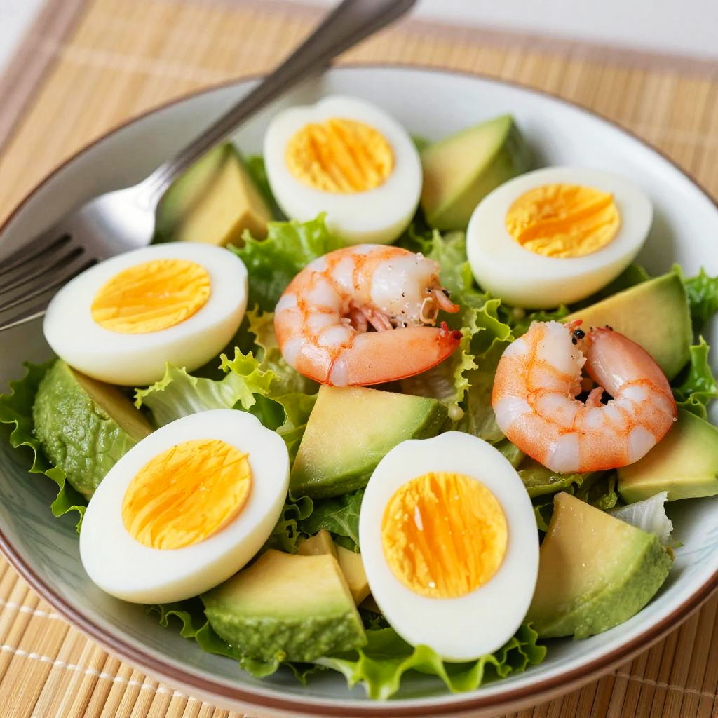 A colorful, close-up photo of a fresh salad in a white plate with blue patterned rim. The salad includes vibrant orange-yellow boiled eggs, pink shrimp, crisp green lettuce, and creamy avocado chunks, all mixed together. A silver fork rests on the left side of the plate. The background features a striped bamboo mat, adding a natural touch to the scene.