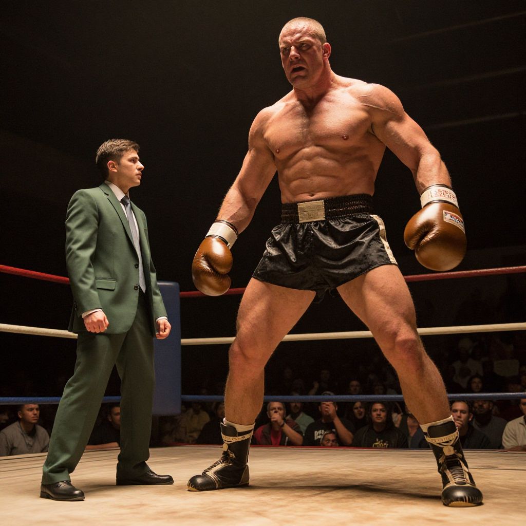 In the center of the image, a colossal figure stands menacingly, his muscles rippling under the dim, yellow light that casts a dramatic glow. He is clad in black trunks and large, worn boxing gloves, his stance wide and aggressive. To his left, a man in a sharp green suit and tie stands with a posture of caution, his hands clenched into fists. The background is a blur of onlookers, their faces indistinct, creating a sense of depth and scale. The scene is set in what appears to be a dimly lit arena or ring, with the lighting focused on the two main figures, emphasizing their confrontation. The overall composition is dynamic, with the towering figure dominating the foreground and the suited man providing a counterbalance, both figures positioned in a way that draws the viewer's eye to their intense interaction.