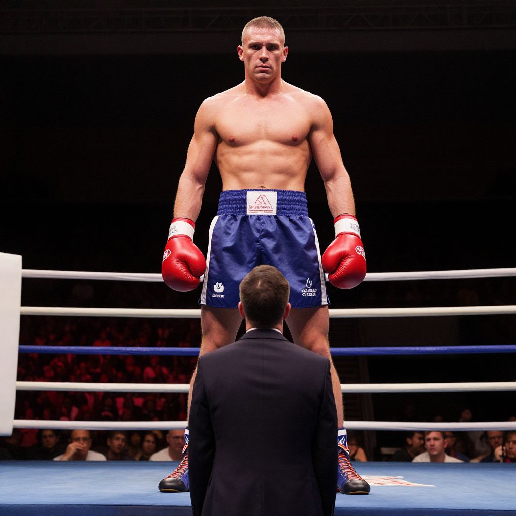 Photograph of a muscular, bald, shirtless male boxer in black shorts and gloves, shouting in the boxing ring, with a suited referee standing to