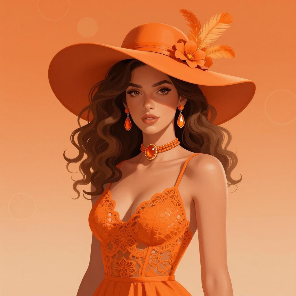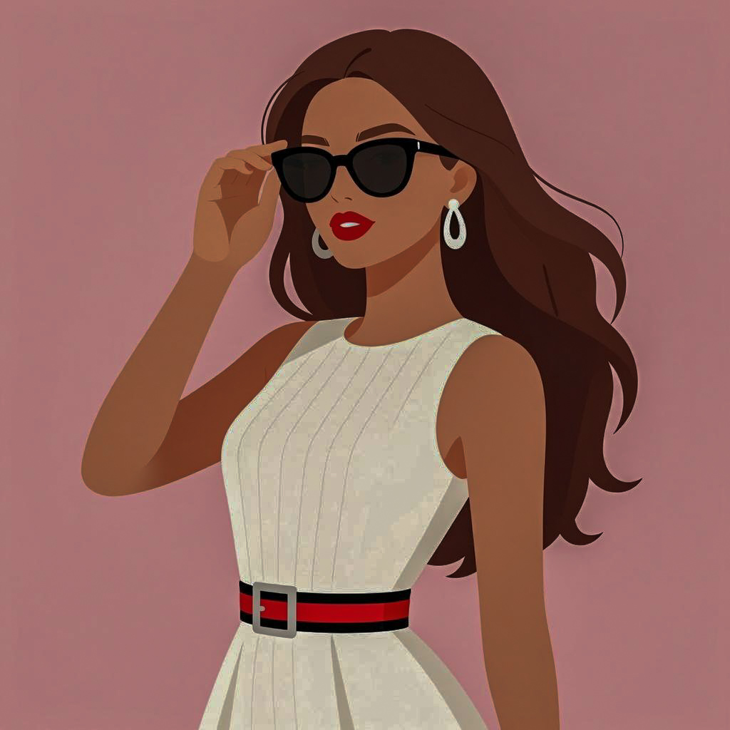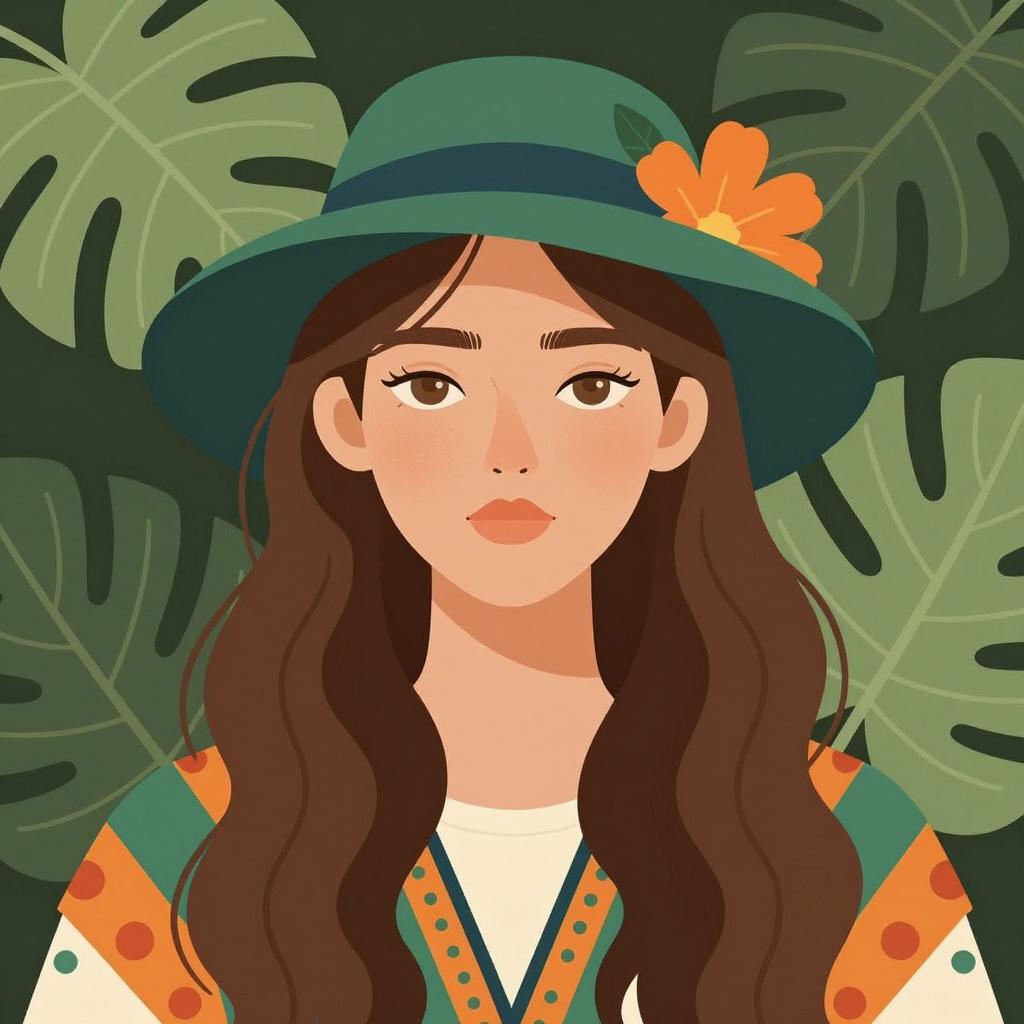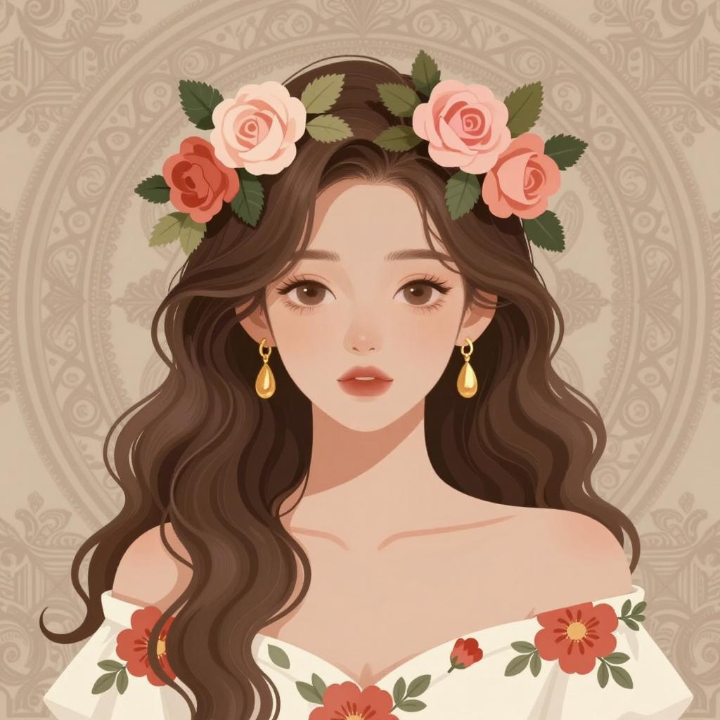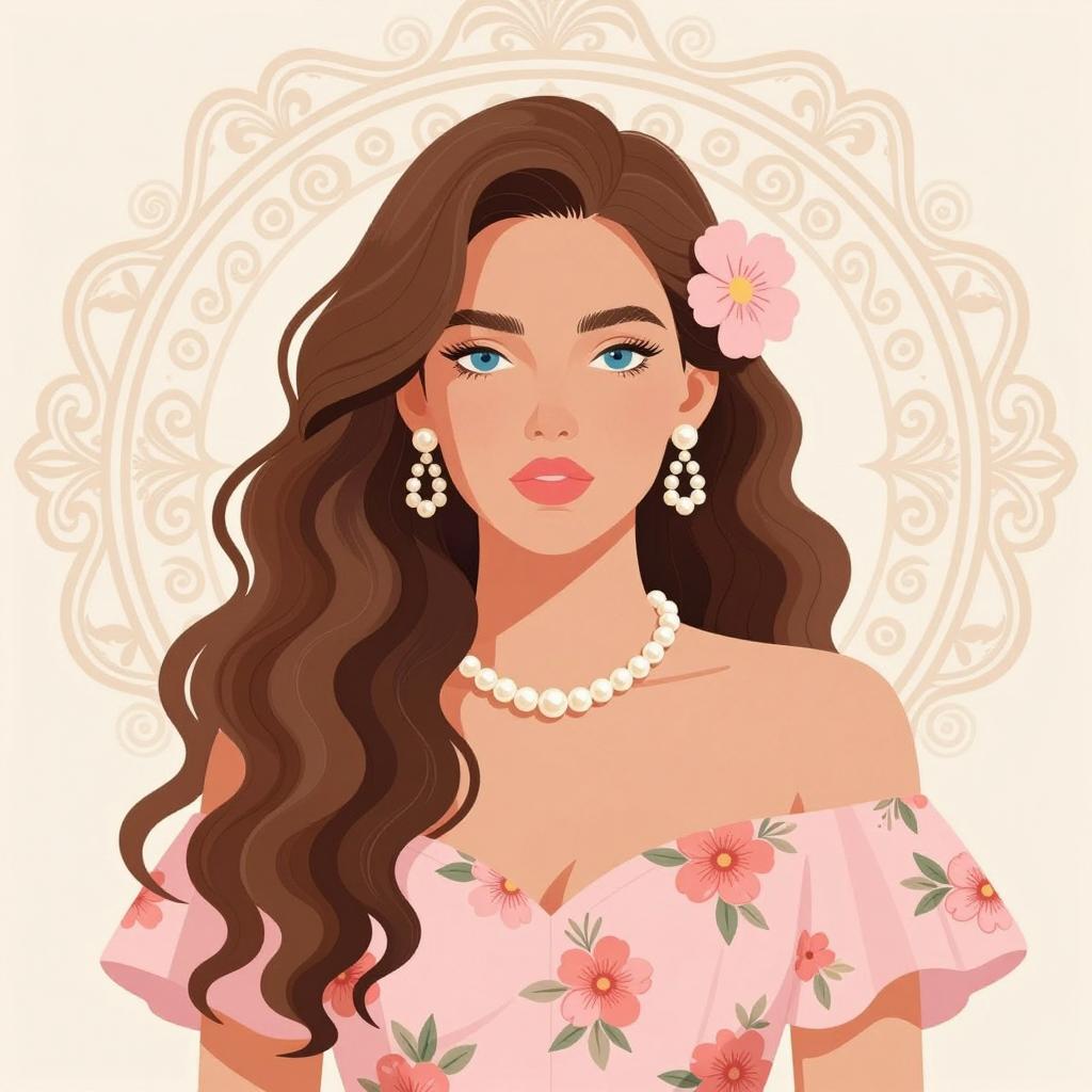 Illustration of a fair-skinned woman with long, wavy brown hair adorned with pink flowers. She has blue eyes, pink lips, and wears a pearl necklace and matching earrings. Pink floral dress with off-shoulder sleeves. Background has intricate, swirling patterns with a circular, ornate halo. Her expression is calm and slightly introspective.