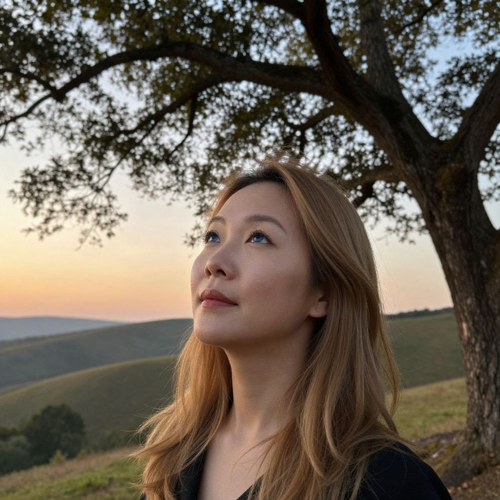 Photograph of an Asian woman with fair skin and shoulder-length, light brown hair, gazing upward with a serene expression. She wears a black top, and her makeup is natural with a soft pink lip color. The background features a tree with a thick trunk and branches, set against a softly lit, orange and blue sunset sky. Rolling hills and greenery are visible in the distance. The image has a warm, natural light, highlighting the woman's face and the tranquil outdoor setting.