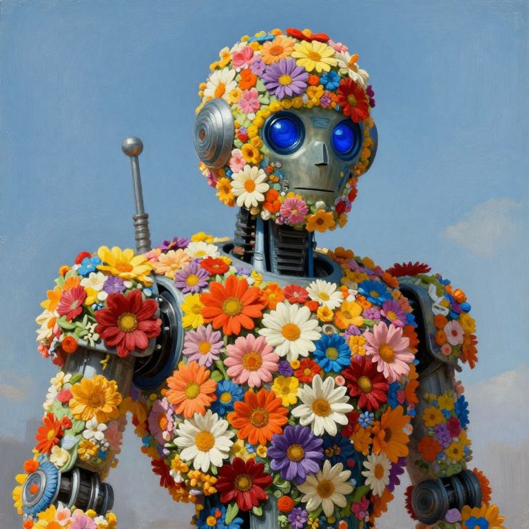 Photorealistic digital art of a robotic figure adorned with vibrant, multicolored flowers covering its metallic body, with large blue eyes, against a clear