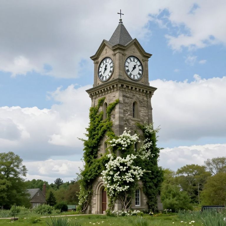 Photograph of a tall, stone clock tower covered in green ivy and white flowers, set against a bright blue sky with scattered clouds, surrounded by
