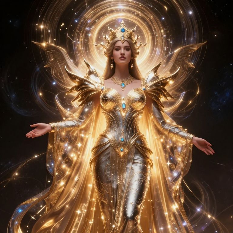 Digital artwork of a regal, ethereal woman with long brown hair and fair skin, standing against a dark, starry background. She wears an ornate, golden armor-like dress with intricate patterns and blue gemstones at the chest and crown. Her dress is adorned with glowing, feather-like extensions and large, radiant wings. She has a serene expression, with arms outstretched. The background features circular, glowing rings and sparkling stars, enhancing the celestial theme. The overall style combines elements of fantasy and sci-fi, with a high-contrast, luminous color palette.